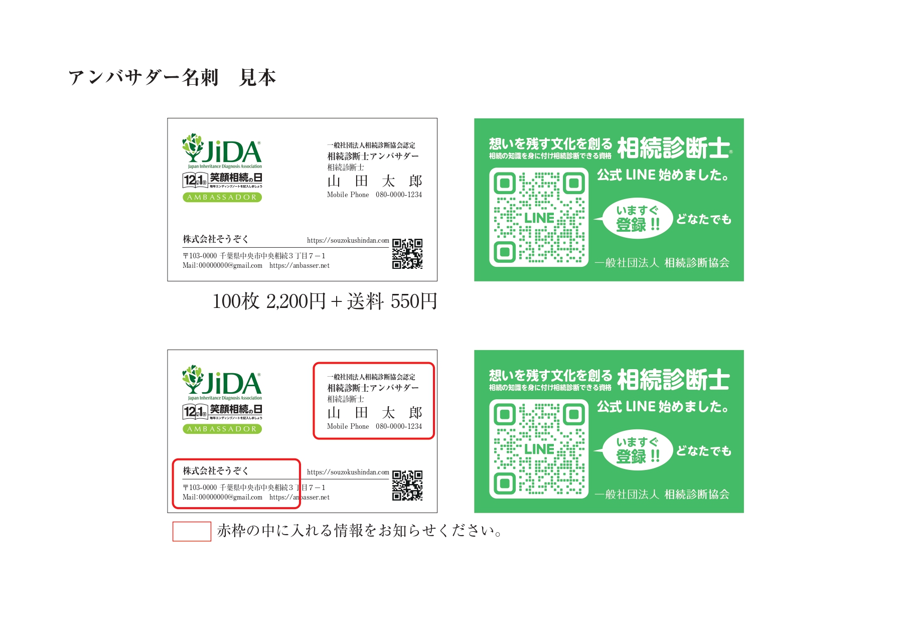 アンバサダーに任命されると、相続診断士アンバサダーとしてホームページに名前を記載し、相続診断士アンバサダーと記載した名刺を持つことが出来ます。