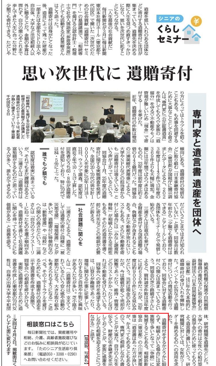 【掲載】『毎日新聞』 2026年3月17日 朝刊 『シニアのくらしセミナー』での遺贈寄付特集にて、小川代表の取材記事が掲載されました。 詳細は以下より是非ご覧ください!